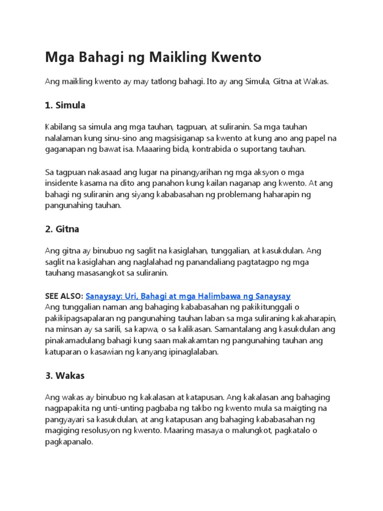 Pagkatapos basahin ang modyul na ito. Kabilang sa simula ang mga tauhan tagpuan at suliranin. Ang maikling kuwento - binaybay ding maikling kwento - ay isang maiksing salaysay hinggil sa isang mahalagang pangyayaring kinasasangkutan ng isa o ilang tauhan at.