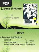 Ang ating susuriing kwento ay ang LUPANG TINUBUAN ni Narciso Reyes. Reyes Tauhan Pangunahing Tauhan Danding Pisikal Sarat ang ilong At Palaisip at gustong nag-iisa emosyonal Pantulong na mga Tauhan Tiya Juana. Matapos na masangkot sa anomalya ang mga pulis ng Manila PoliceDistrict Station Anti.