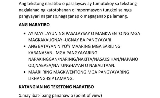 Paglalahad ng Totoong PangyayariPangkasaysayan b. Tinatawag na tekstong impormatib ang mga babasahin at akdang nagbibigay ng impormasyon kaalaman at paliwanag tungkol sa isang tao bagay lugar hayop o pangyayari. Banghay ito ang tawag sa maayos na daloy o pagkakasunod-sunod ng mga pangyayari sa mga tekstong naratibo upang mabigyang-linaw ang temang taglay ng akda.