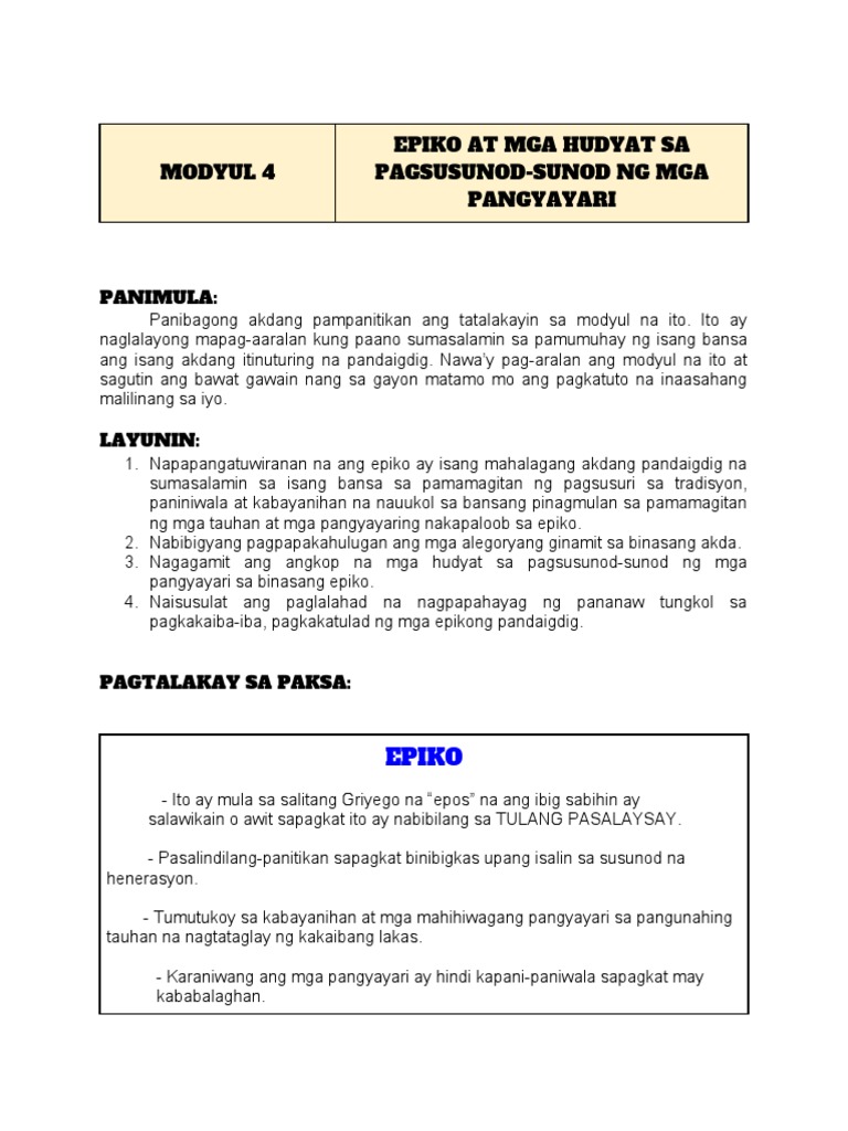 Modyul 4 Epiko At Mga Hudyat Sa Pagsusunod Sunod Ng Mga Pangyayari Pdf
