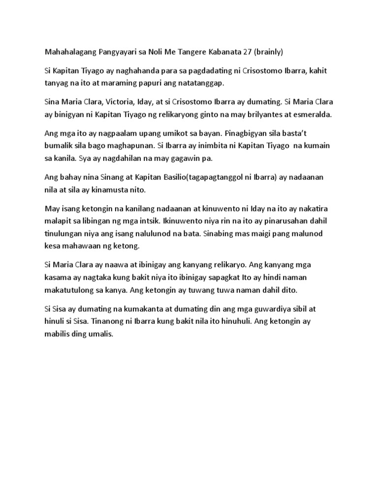 Buod ng iba't ibang pangyayari ng noli me tangere. Maraming mga pangyayari sa ating buhay ang hindi n. CE Publishing IncMabuhay Pilipinas. Nang lumaganap sa bansa ang 2000 kopya ng nobela nakarating din ito sa mga Espanyol na labis na nagalit sa mga isinulat ni Rizal.