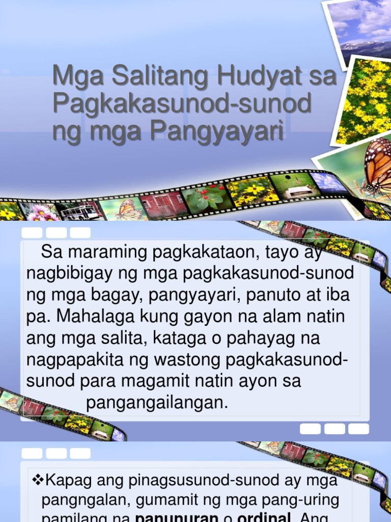 Pagsasaayos ng mga larawan ayon sa Pagkakasunod-sunod. Pagkakasunod-sunod ng mga Pangyayari Sa maraming pagkakataon tayo ay nagbibigay ng mga pagkakasunod-sunod ng mga bagay pangyayari panuto at iba pa.